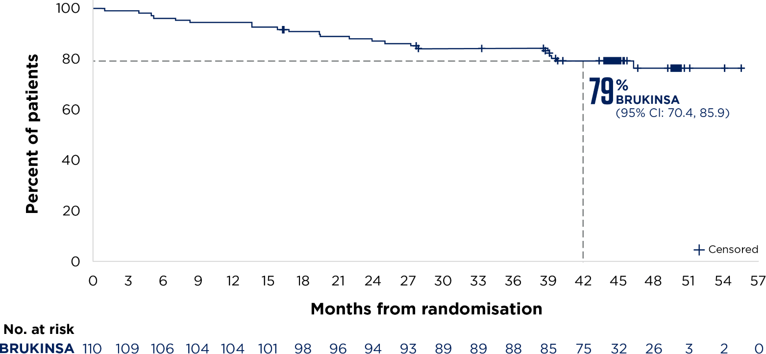 SEQUOIA was a randomised, open-label, Phase 3 trial of BRUKINSA vs BR in patients with TN CLL. Because patients with CLL/SLL whose tumours exhibit del(17p) have an unfavourable prognosis and respond poorly to standard CIT, patients with del(17p) mutations were assigned to receive BRUKINSA in a separate single-arm exploratory analysis. Cohort 1 enrolled patients without del(17p): BRUKINSA vs BR (n=479). Cohort 2 enrolled patients with del(17p); BRUKINSA single arm (n=111).2